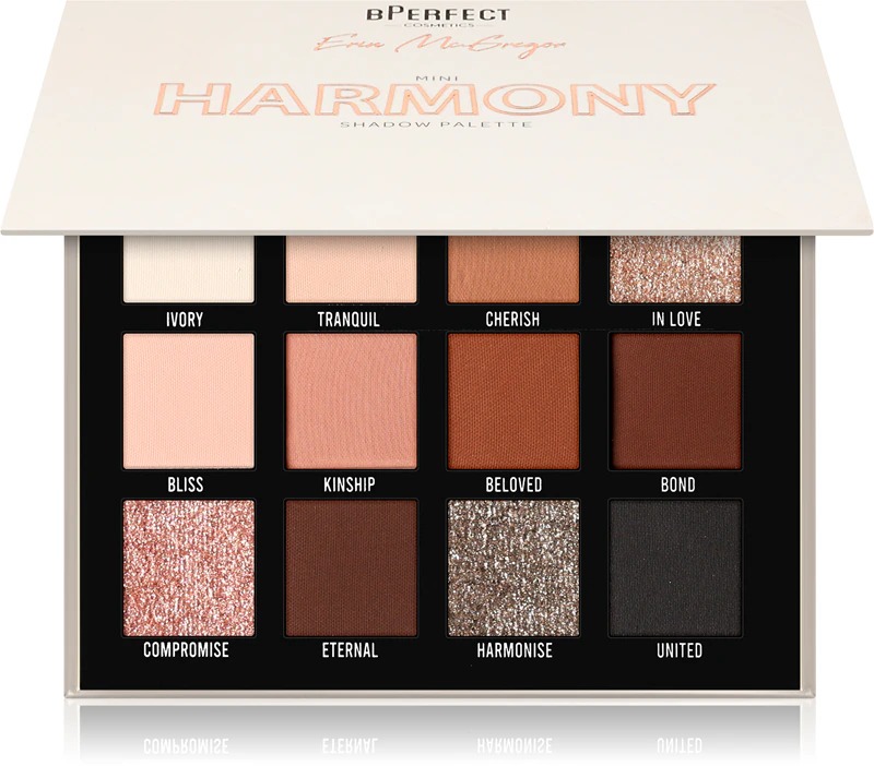 Uma bela combinação de tons rosa suaves, quentes e rosados em acabamento fosco, complementada por pigmentos prensados que refletem a luz.